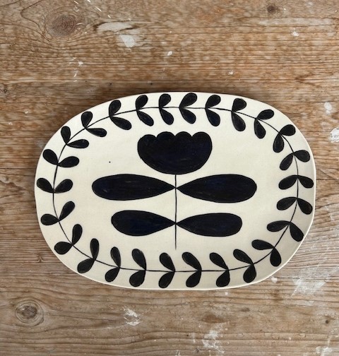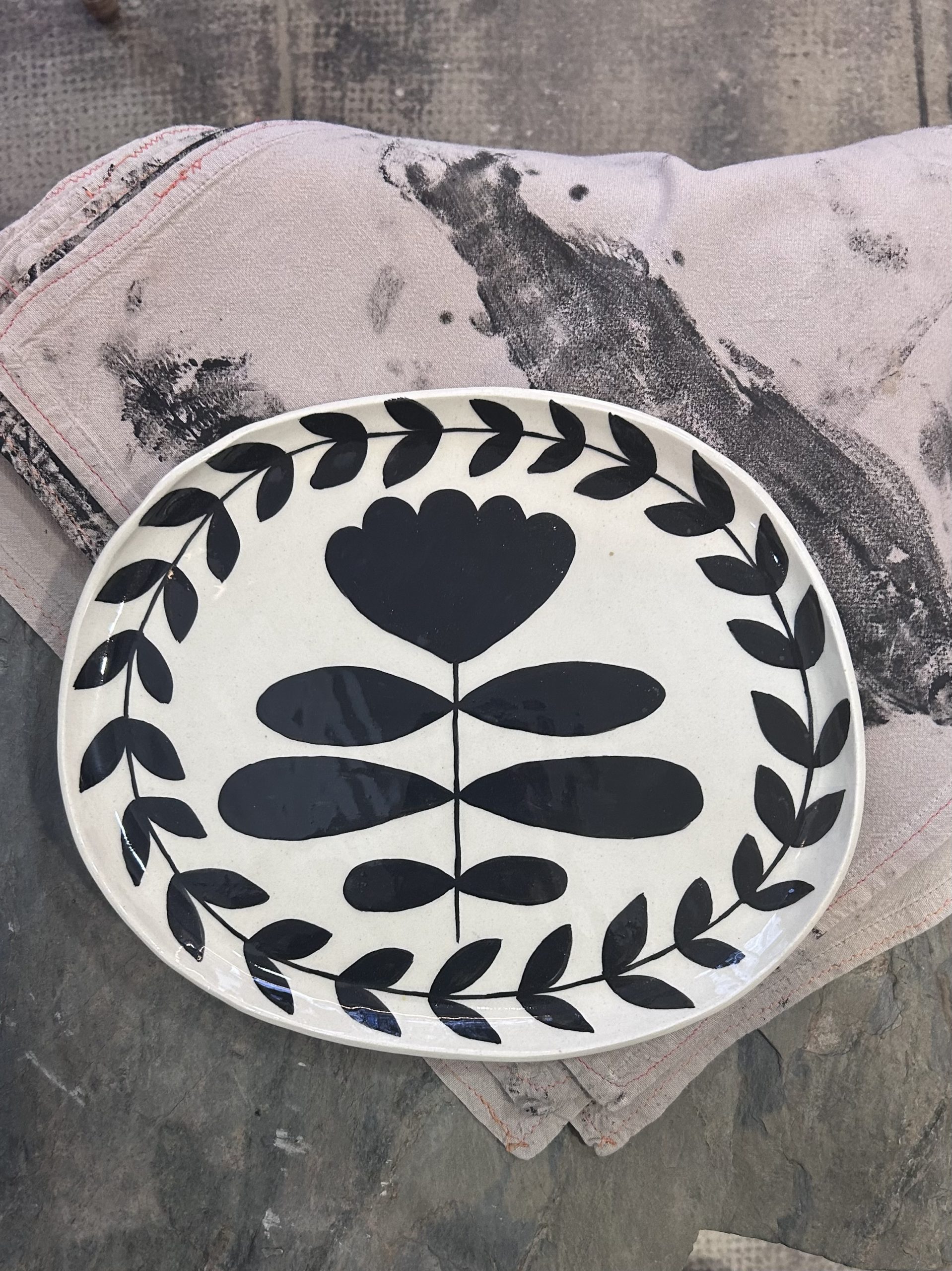 Grand plat de service ovale entièrement réalisé à la main grâce à la technique de la plaque et du modelage.